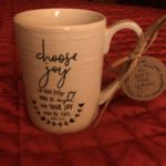 I also have… The red joy Scripture verses that I’ve torn out of the back of my study book and carefully placed in different areas of my home, a joy ornament hanging on my tree from a dear friend, and a little ceramic jar with the word joy on it sitting in my kitchen window where I wash dishes. I also decided to keep a piece of furniture as a reminder to be real – to look at the worn and imperfect places with joy, love, and thankfulness because it means that I am blessed with family and friends that use it often! And most recently , this sweet surprise from a friend that I will use this morning, for the first time, to drink my morning coffee!